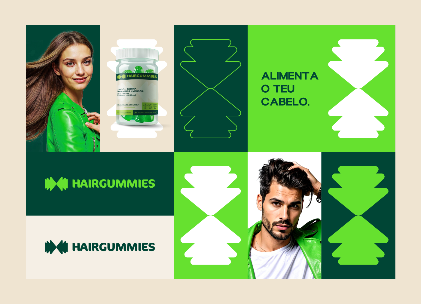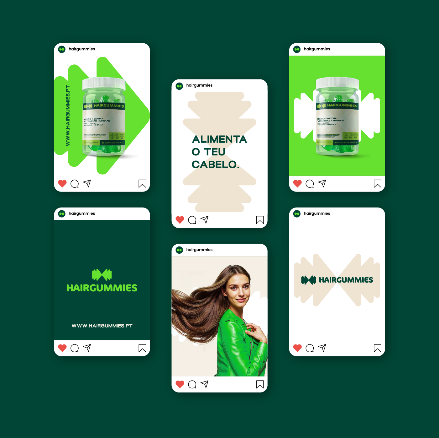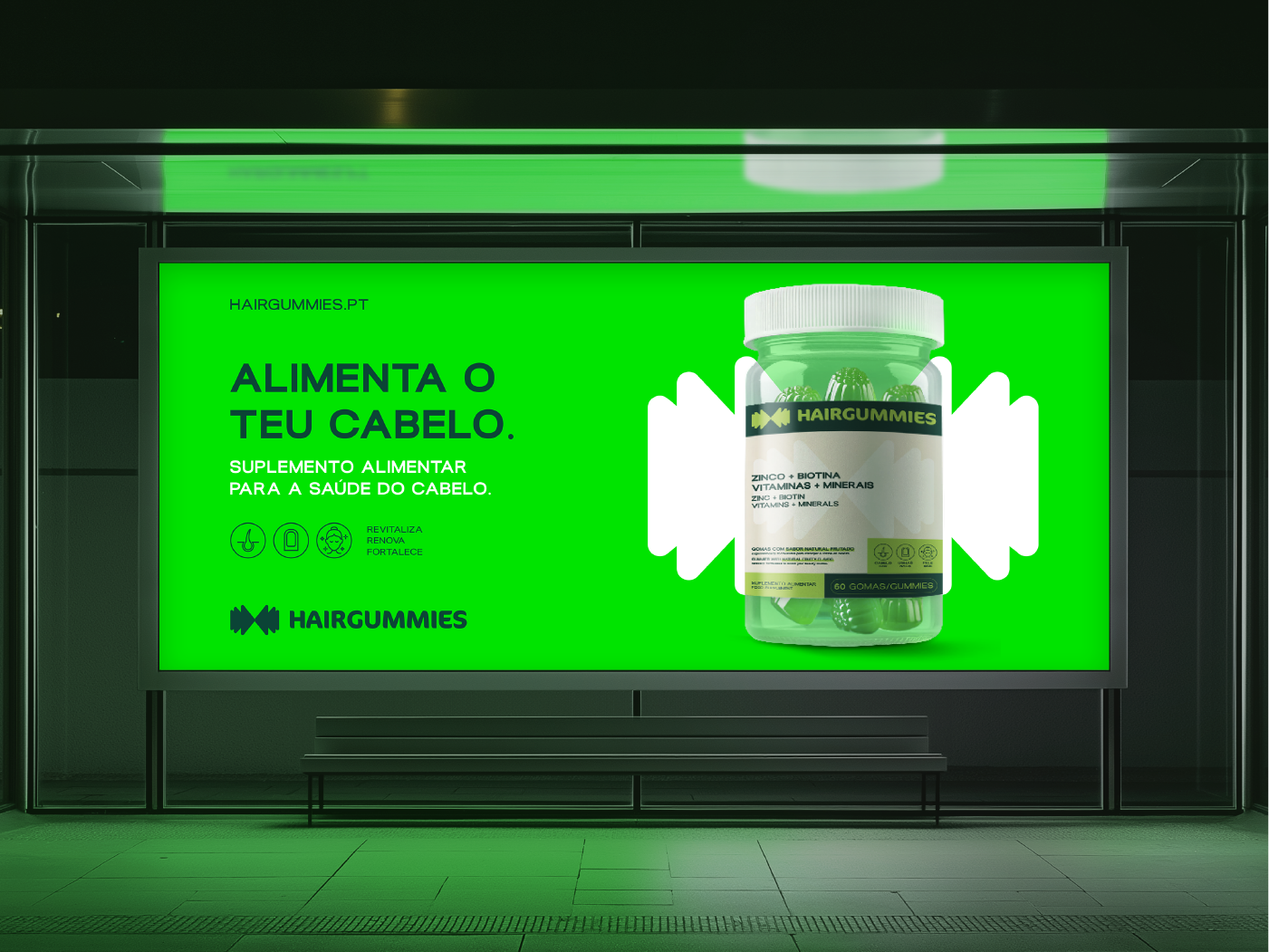 The visual identity was designed to be pure energy: the logo features a geometric symbol representing dynamism and vitality. The color palette is disruptive, using an “Energy Green” (neon) – the color of the gummy itself – as the main color. The connection to the Hairlox brand was ensured through the use of “Refined Green” (dark green), the same font family, and the symbol, creating a cohesive brand ecosystem.